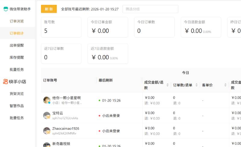 出单提醒、批量多账号上商品、批量移除商品、订单统计、库存提醒